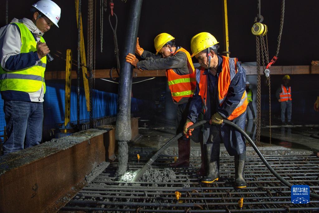 中铁十局施工人员在广湛铁路长兴村特大桥跨沈海高速连续梁合龙段浇筑混凝土(3月29日摄)。