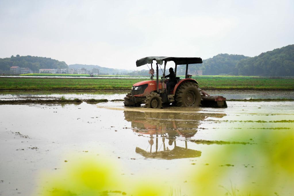 3月23日,在湖南省常宁市三角塘镇江南村,村民驾驶农机在整理早稻秧田。新华社发(周秀鱼春 摄)