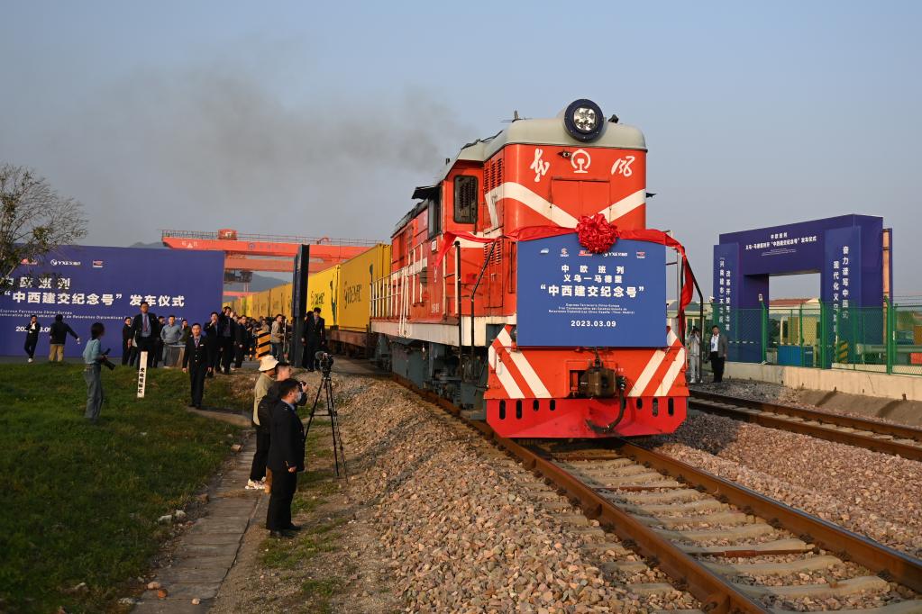 3月9日,义乌—马德里“中西建交纪念号”中欧班列从铁路义乌西站开出。新华社记者黄宗治 摄