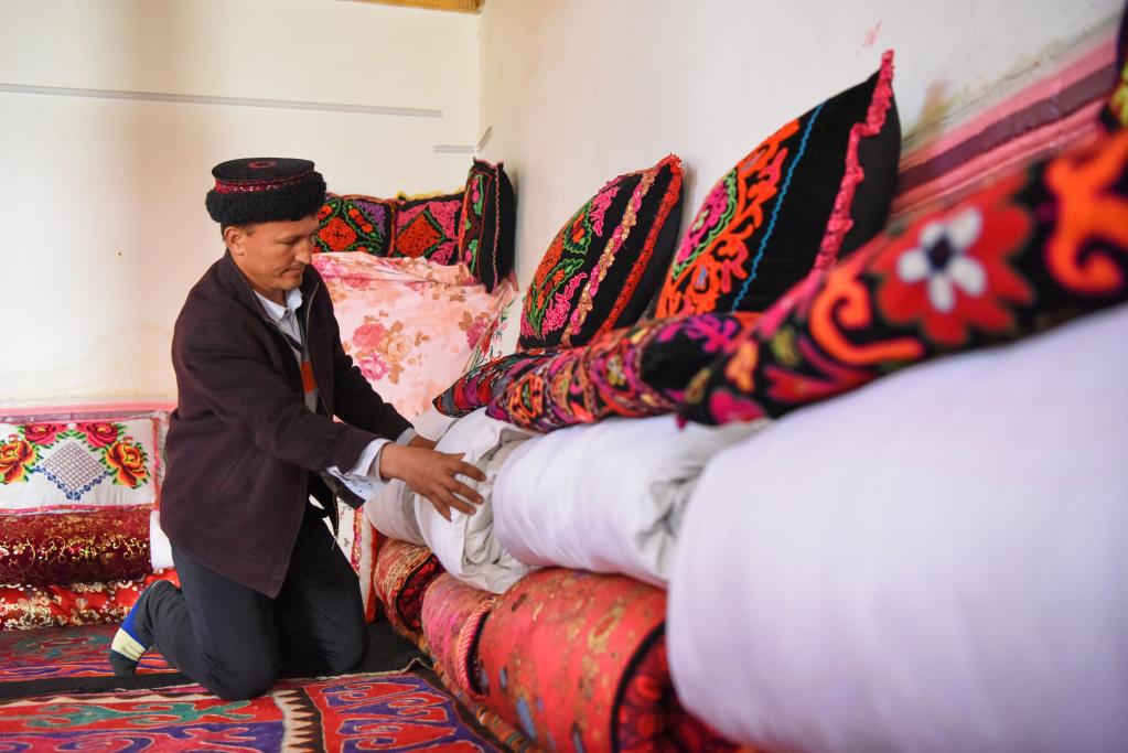 3月29日,在新疆阿克陶县塔尔塔吉克民族乡,巴格艾格孜村村民巴图尔·库尔班在整理民宿床铺。新华社记者 丁磊 摄