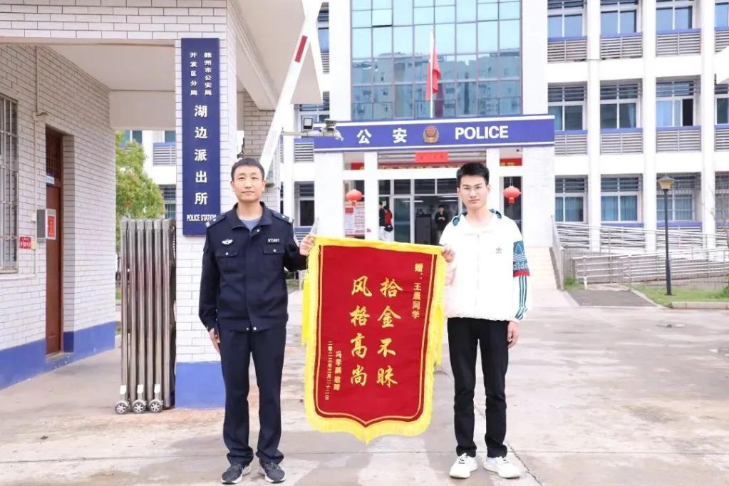 将写有“拾金不昧 风格高尚”字样的锦旗
