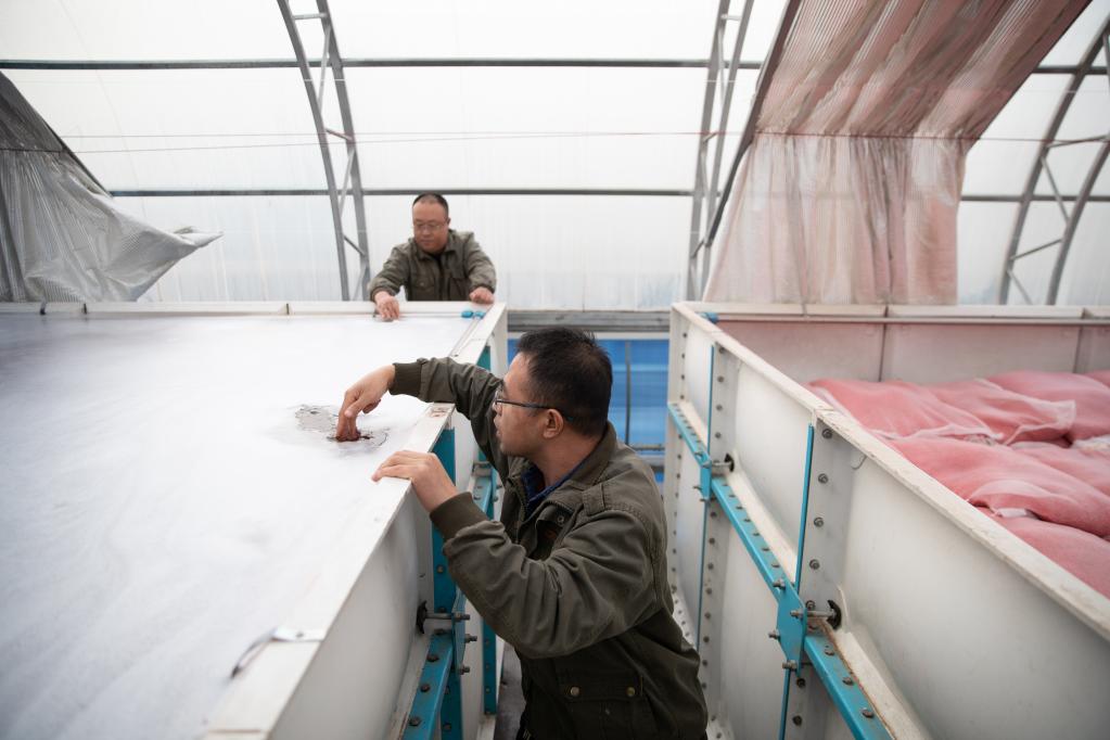 3月24日,在北大荒集团八五〇农场有限公司智能化水稻芽种生产中心,工作人员检查浸种情况。新华社记者 张涛 摄