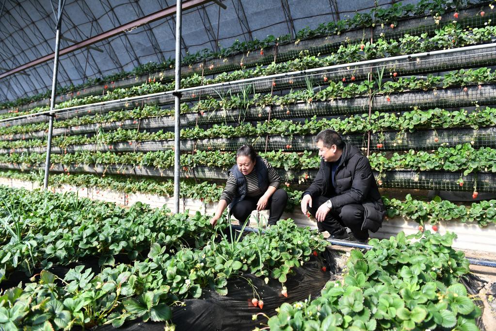 3月2日,在吉林市永吉县口前镇,农业技术人员(右)向农民传授草莓种植技术。新华社记者 张楠 摄