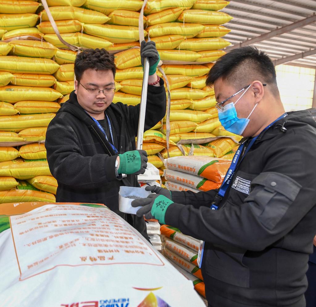 3月23日,在吉林省四平市梨树县一家农资生产企业,工作人员对企业生产的产品进行抽样检验。新华社记者 张楠 摄