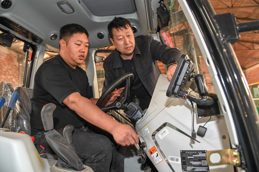3月23日,在吉林省四平市梨树县白山乡岫岩村,梨树县农机推广总站站长张志刚(右)帮助农民调试农机。新华社记者 张楠 摄