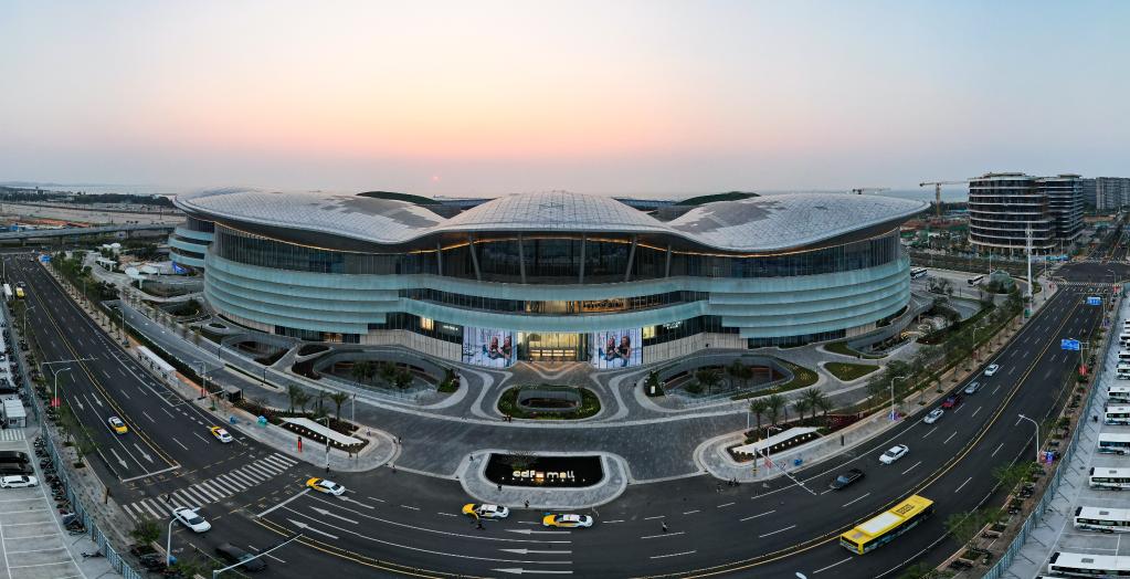 航拍夕阳下的海口国际免税城(无人机照片,2023年4月4日摄)。新华社记者 杨冠宇 摄