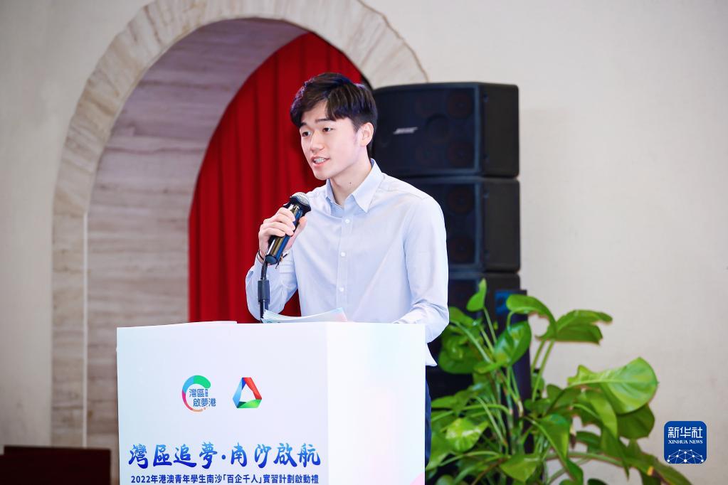 澳门青年李伟杰在2022年港澳青年学生南沙“百企千人”实习计划启动仪式上分享经验(2022年7月28日摄)。新华社发(受访者供图)