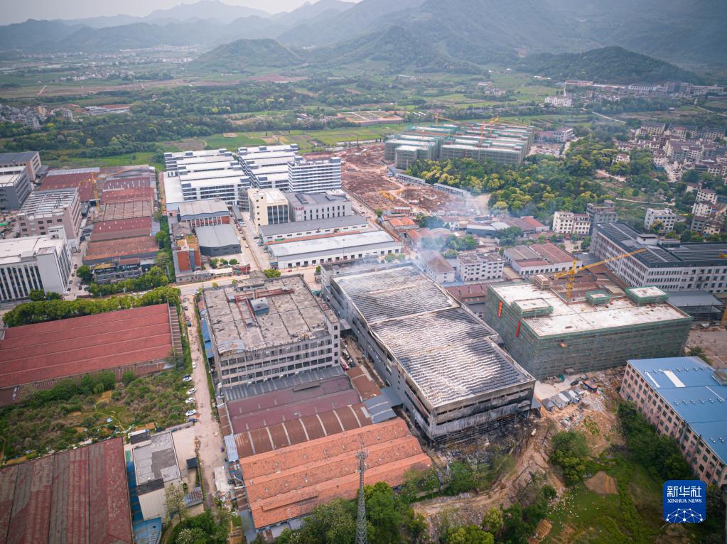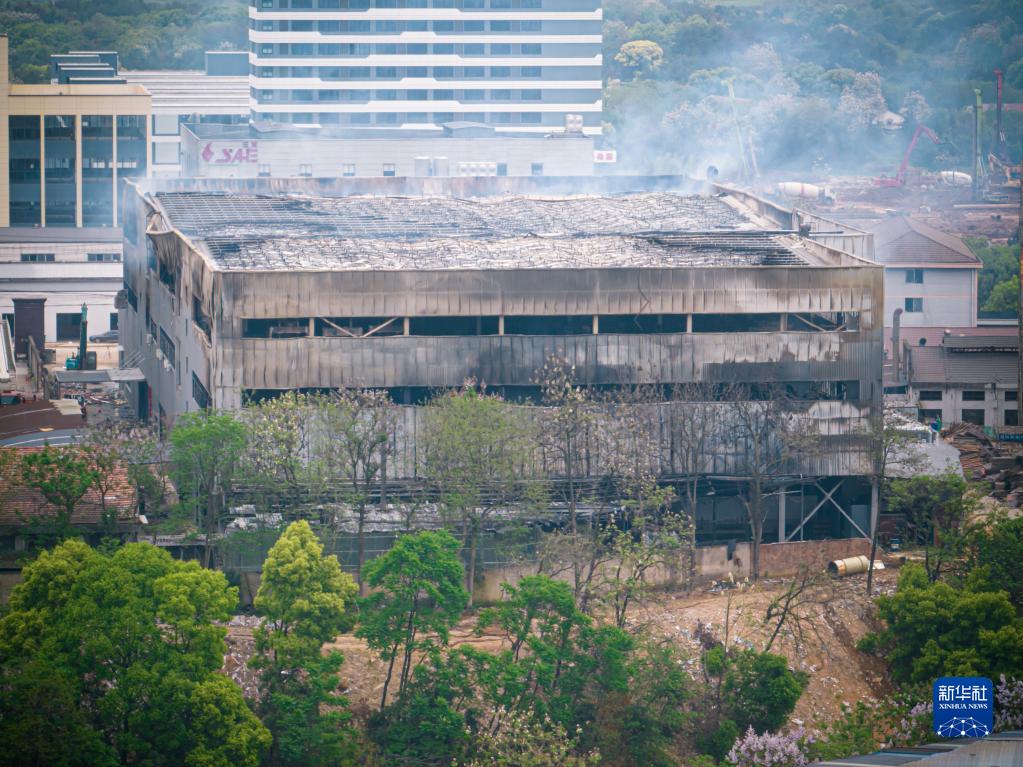 这是4月18日拍摄的金华市武义县浙江伟嘉利工贸有限公司厂房火灾现场(无人机照片)。新华社记者 江汉 摄