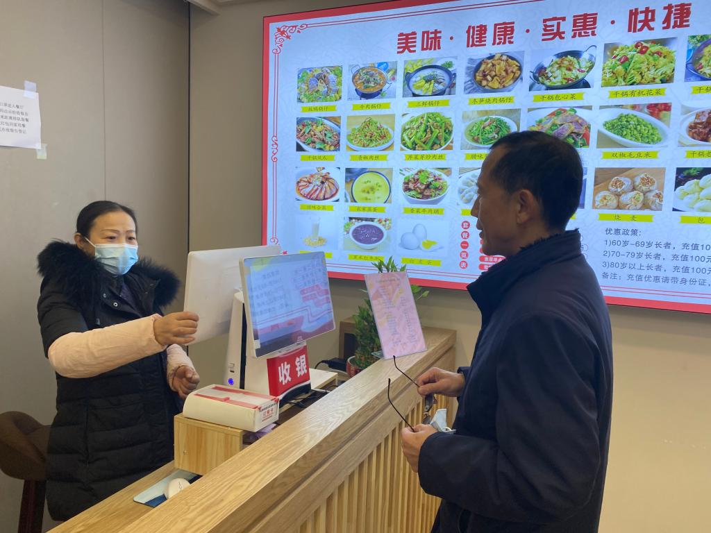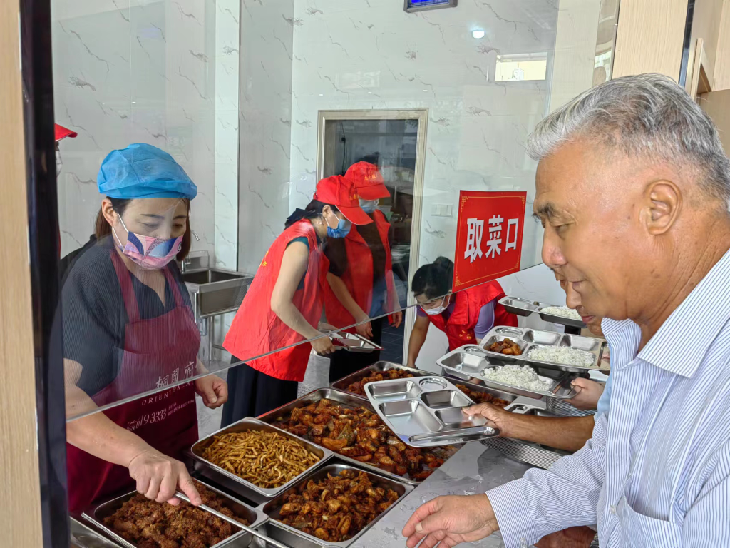 安徽省安庆市大观区石化路街道大湖社区的老年食堂内,70多岁的宋烈勋一边和老友打招呼,一边打好了饭菜。