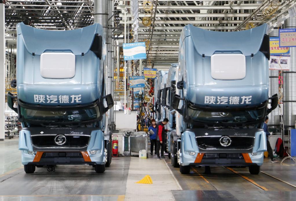 4月12日,陕汽新疆汽车有限公司的生产线正在组装天然气重卡。新华社记者于涛摄