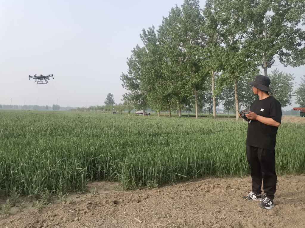 在安徽省蚌埠市怀远县徐圩乡,盛世兴农农机专业合作社理事长尚跃正在田头指挥工人们开展小麦赤霉病防治飞防作业。“今年我有3万亩托管麦田要开展防治,预计两三天就能飞防一遍。”他说。