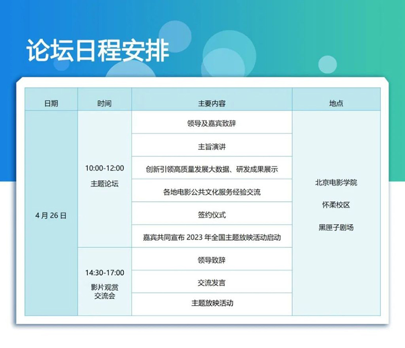 论坛作为第十三届北京国际电影节的重要板块,将围绕深入推进公益电影放映优化升级,吸引更多社会资源参与电影公共文化服务,促进城乡电影公共服务体系一体建设,持续巩固和扩大公益电影放映覆盖面,更好保障人民群众基本文化权益,大力弘扬社会主义核心价值观,推动社会主义精神文明建设,守好基层宣传文化阵地等内容开展研讨,并举办公益影片交流会和主题放映活动,用更高亮度、更清晰画面的数字电影智能新终端给观众带来全新感受。