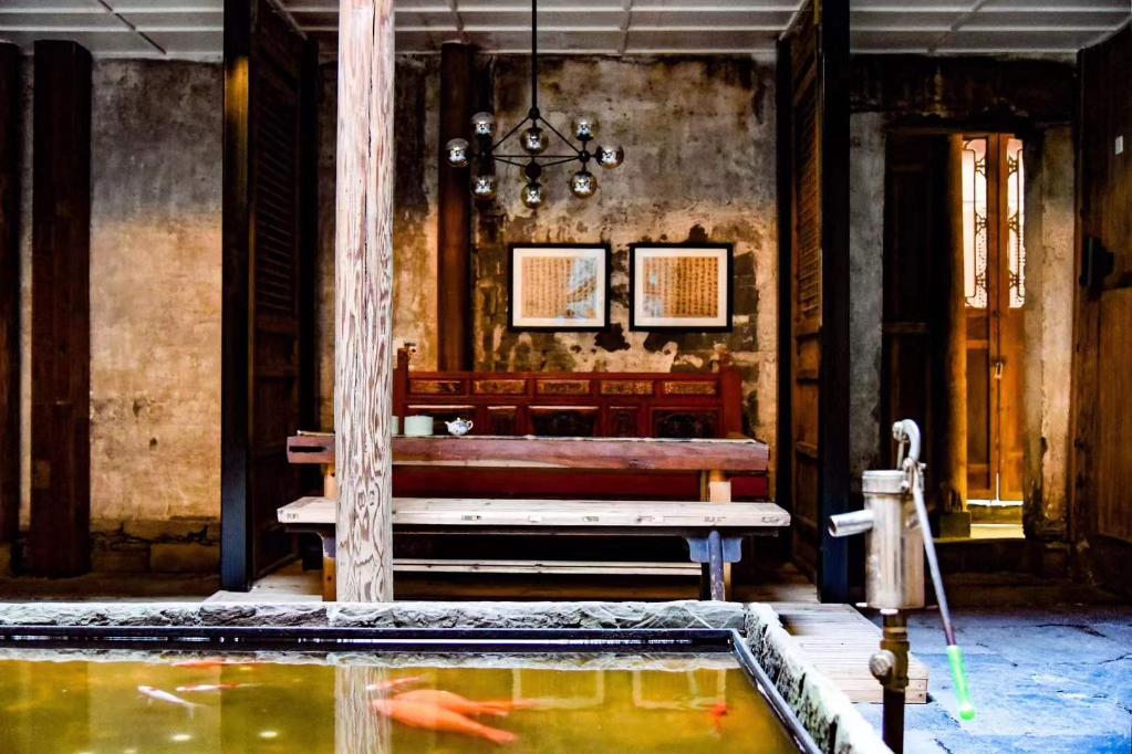 推开“天净沙”吱呀作响的高窄门,四水归堂的天井、阳光映照的“福”字老墙、百年老房梁化身的吧台……历史的气息扑面而来。