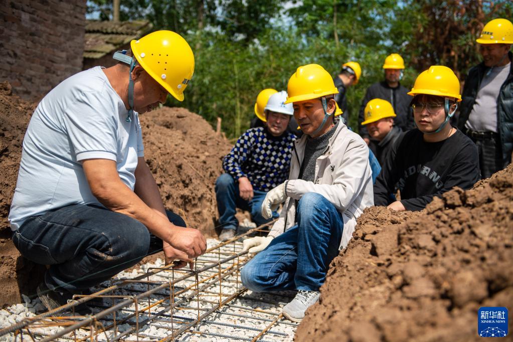 4月25日,在常德市安乡县一建筑工地,技师(左一)向工人们讲解扎筋技巧。新华社记者 周勉 摄