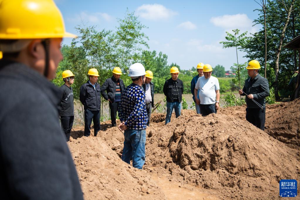 4月25日,在常德市安乡县一建筑工地,技师(右一)向工人们介绍建筑材料。新华社记者 周勉 摄