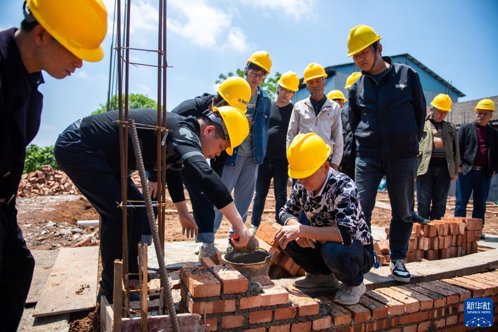 4月25日,在常德市安乡县一建筑工地,工人们在实操砌墙。新华社记者 陈思汗 摄