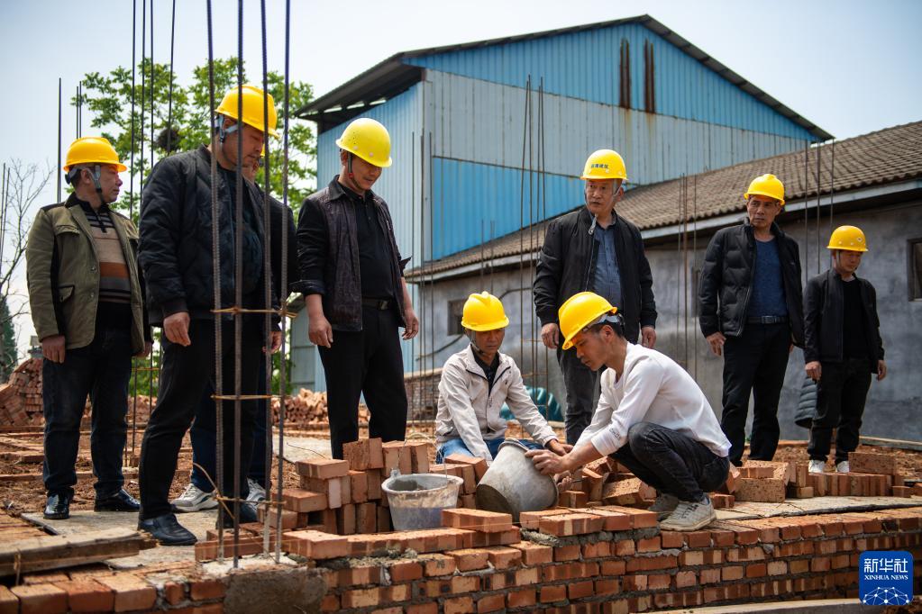 4月25日,在常德市安乡县一建筑工地,技师向工人们展示砌墙技巧。新华社记者 陈思汗 摄