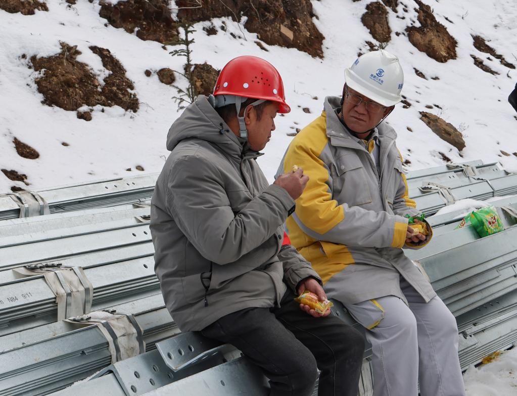 腊巴山风电建设现场,李现臣(右)在雪地里边吃简餐边交流工作。受访者供图