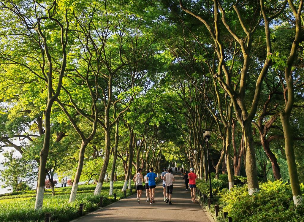 5月1日清晨西湖边的晨跑者。新华社记者 方问禹 摄