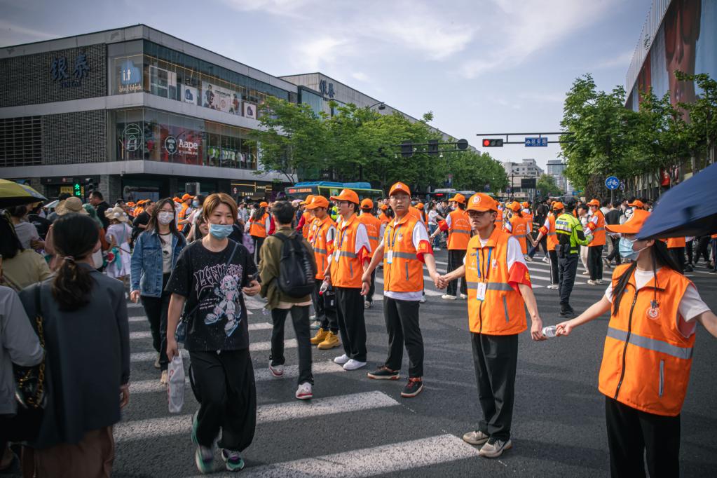 上午11点多,湖滨商圈交通干道的十字路口,80名身穿橙色马甲的志愿者成为西湖景区一道亮丽的风景线。