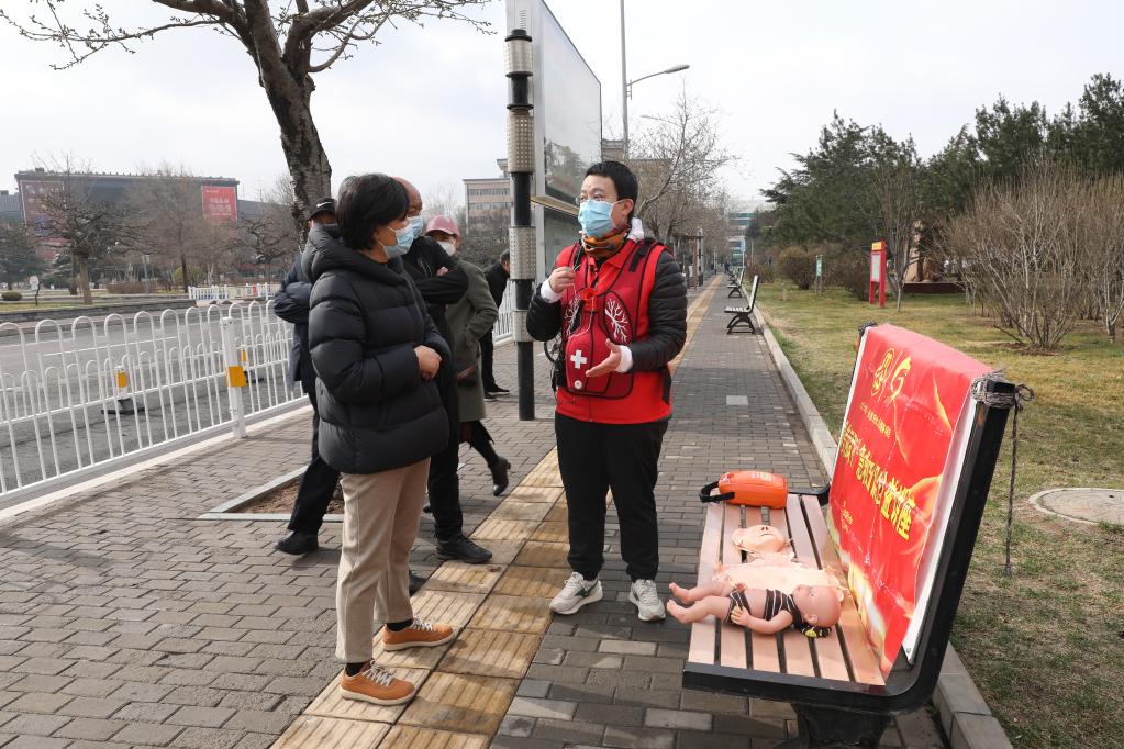 范潞霞在为市民义务讲解急救知识。新华社记者 徐伟 摄