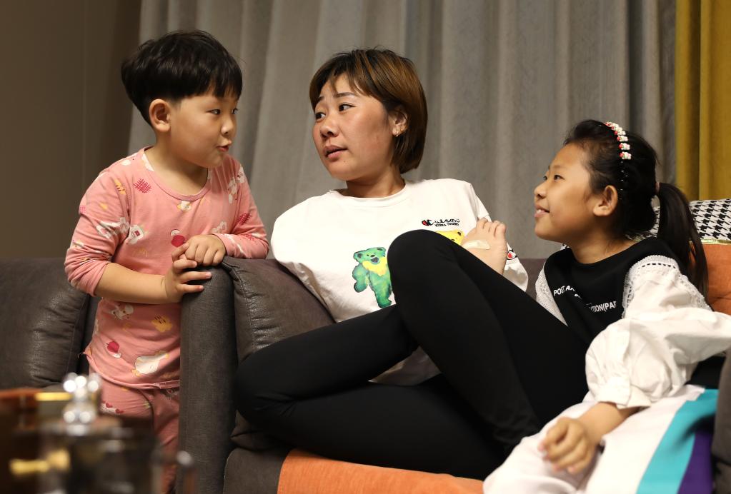 5月11日,韩丹和两个孩子在聊天。新华社记者 姚剑锋 摄