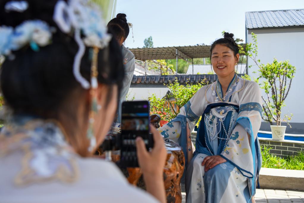 在新疆伊犁哈萨克自治州霍城县大西沟乡桃花村,游客穿着汉服在一家民宿内拍摄短视频(5月17日摄)。新华社记者丁磊 摄