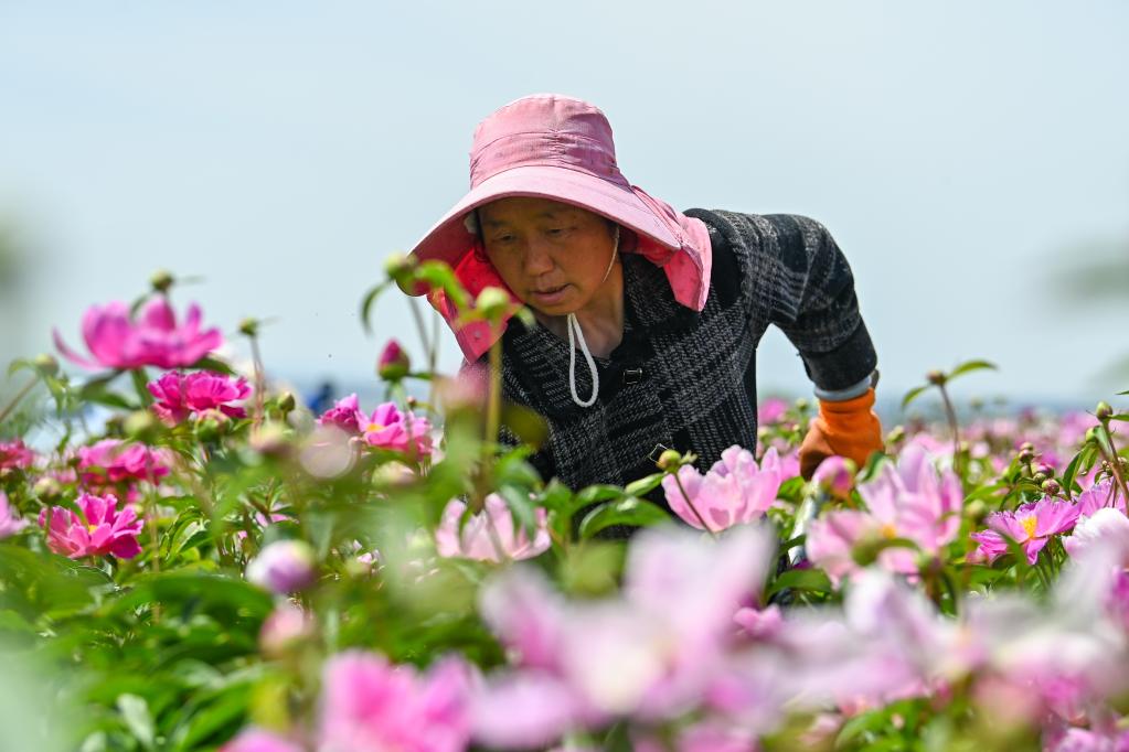 “花经济”持续升温下,越来越多农民走出家门,成为产业工人。入夏,走进伊宁县天山花海景区,连片芍药、亚麻花争相盛开,工人正在田间加紧除草、养护。