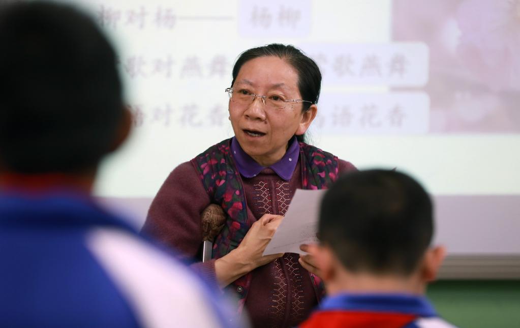 残疾教师张兰萍在给一年级学生上课。新华社记者郭刚 摄