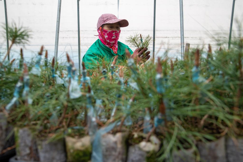 5月20日,在伊春森工集团红松种苗繁育基地,工作人员在养护轻基质网袋红松苗。新华社记者 张涛 摄
