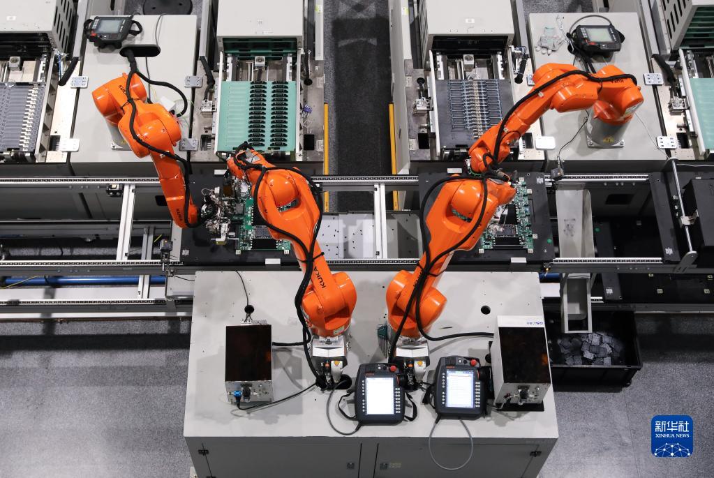 5月22日,在紫光恒越(杭州)技术有限公司“未来工厂”,机械臂在工作中。新华社记者 杜潇逸 摄