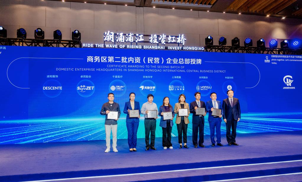 5月25日,“潮涌浦江·投资虹桥”2023虹桥国际中央商务区投资促进大会现场,7家新认定的内资(民营)企业总部集体授牌。新华社记者周蕊 摄