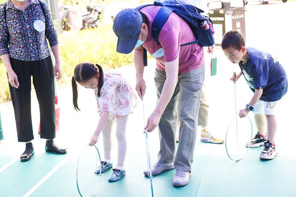 活动中,家长与小朋友们在“亲子运动打卡专区”领取“运动纪念集章卡”后,各组家庭通力合作,依次完成滚铁环、拍篮球、跳绳、踢毽子和健步走等亲子运动。小朋友们为集齐专属勋章勇往直前、努力拼搏,与父母一同获得了独一无二的游戏成就。
