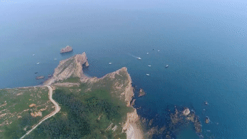 长岛的南隍城岛俯瞰及南隍城国家级海洋牧场示范区。
