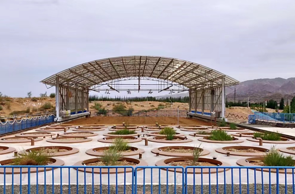 36个大型称重式蒸渗仪,地表部分像是一个个直径2米多的大圆盘,里面种着柠条、油蒿、沙冬青、梭梭等多种固沙灌木;地下部分则是深度3米多的筒体,里面装着来自这些灌木“故乡”——腾格里沙漠、科尔沁沙地、古尔班通古特沙漠等北方沙区的沙土。