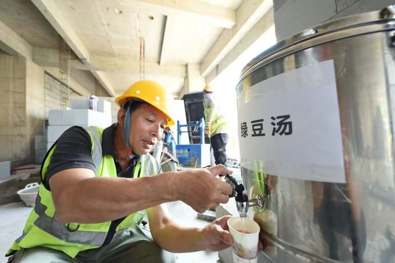 建筑工人在河北工程大学附属医院复兴院区项目施工现场饮用绿豆汤。新华社记者 赵鸿宇 摄