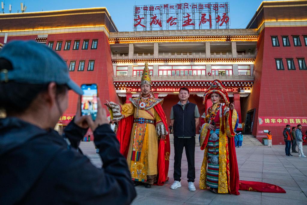游客在文成公主剧场前和演员合影留念(6月6日摄)。新华社记者 孙非 摄