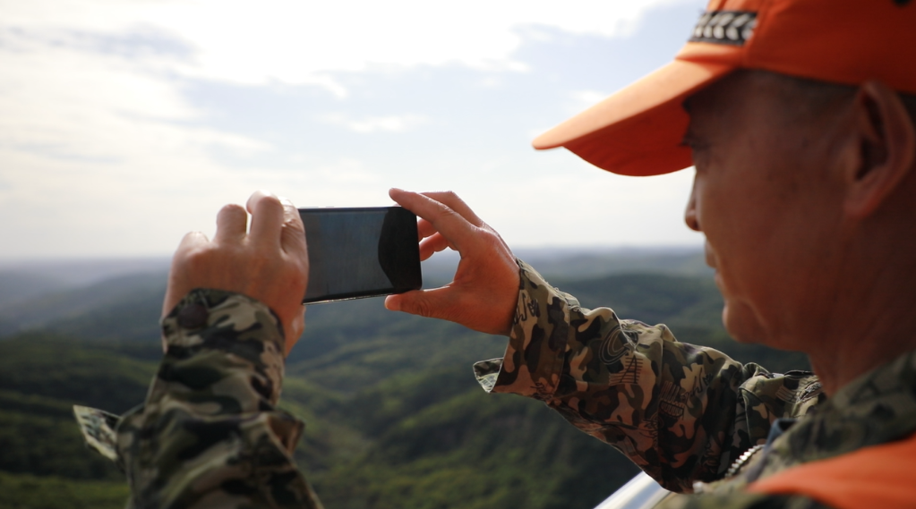 赵建平站在瞭望塔上俯瞰子午岭(6月1日摄)。新华社记者 梁军 摄