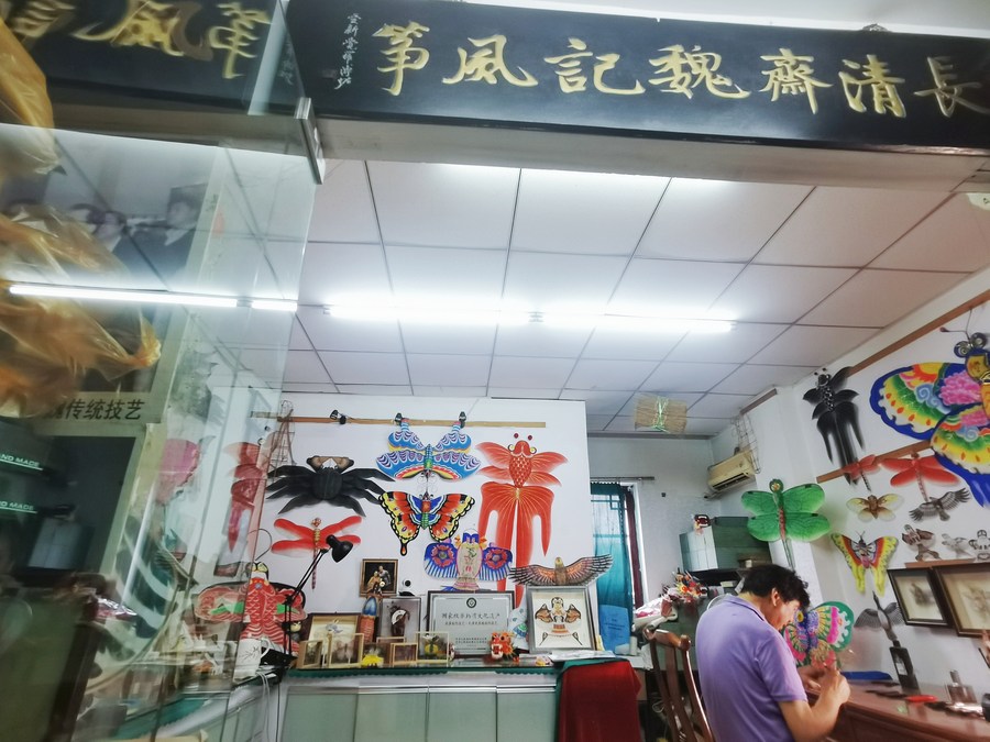 碧瓦红砖、雕梁画栋,沿着位于城区正中的鼓楼漫步探寻,挂有“长清斋魏记风筝”牌匾的小屋就隐身于街侧一家书画城内。