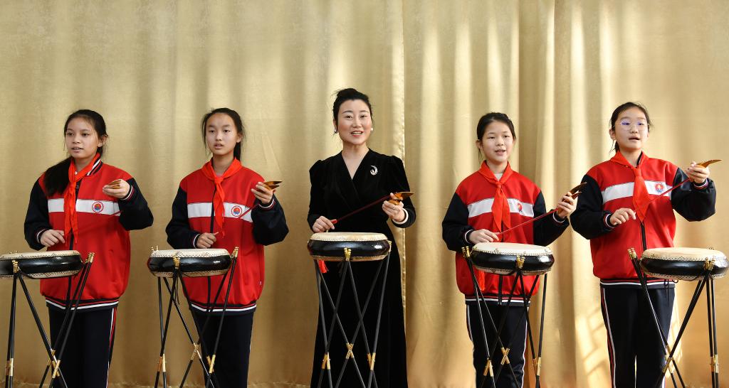 传承人李雪(中)带领学生演唱西河大鼓。新华社发(苑立伟摄)