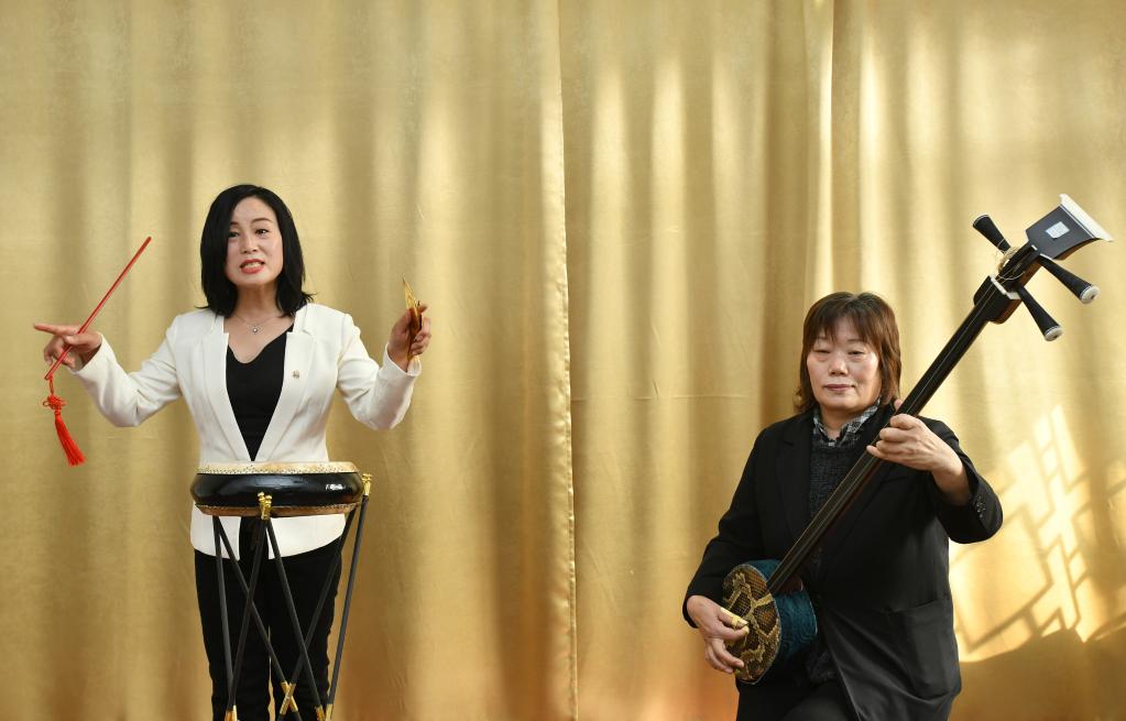 西河大鼓传承人张领娣(右)为青年演员伴奏。新华社发(苑立伟摄)