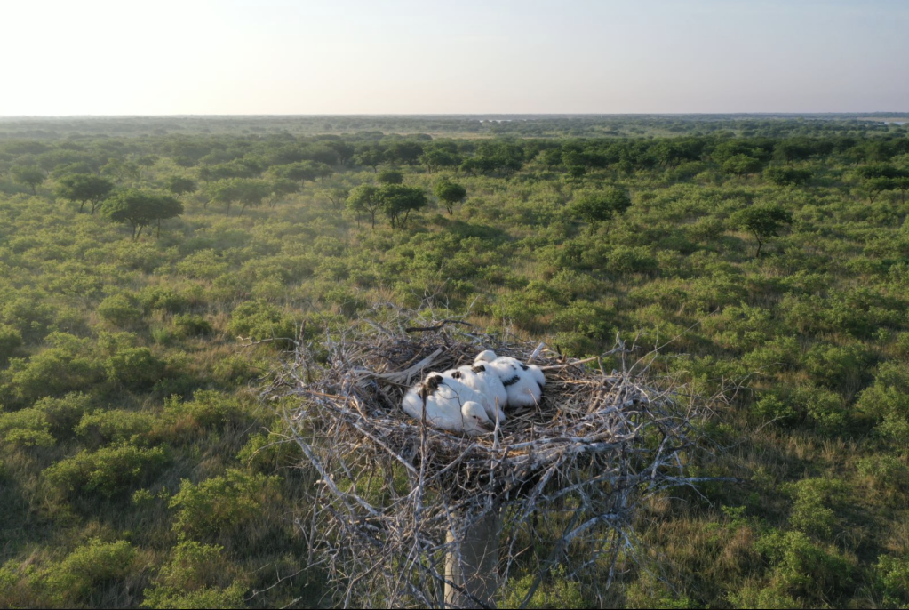 6月16日在科尔沁国家级自然保护区人工招引巢中的东方白鹳幼鸟。(梁永峰 摄)