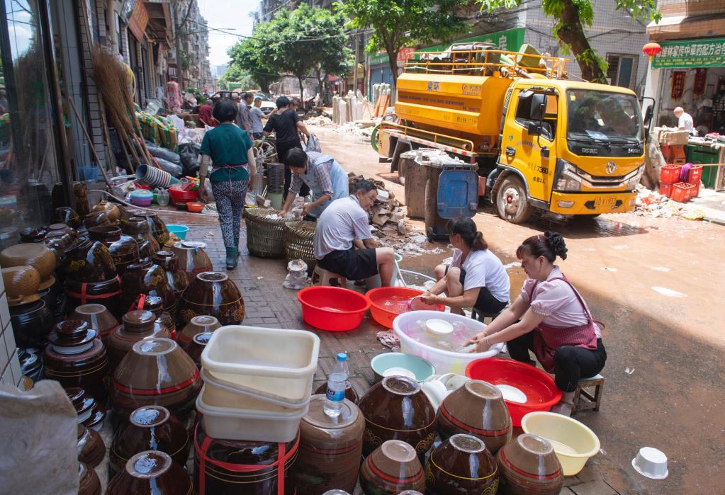 在洪水肆虐过的老街上,记者看到沿街居民、商户忙着清理淤泥,归置、清洗各类物品。沿途有不少武警官兵、民兵队伍及环卫工人等协同开展清淤作业。