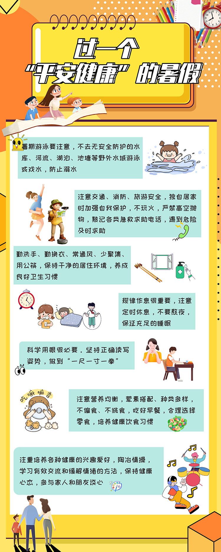 暑假既是孩子们最快乐的时光,也是各种危险易发高发期。在享受假期、放松身心的同时,一能不能让健康安全防护 “放假”,家长们要悉心引导孩子度过一个安全、健康、文明、快乐的暑假。