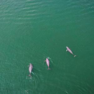 长江江豚在水中嬉戏(2021年5月11日摄,无人机照片)。新华社记者肖艺九 摄