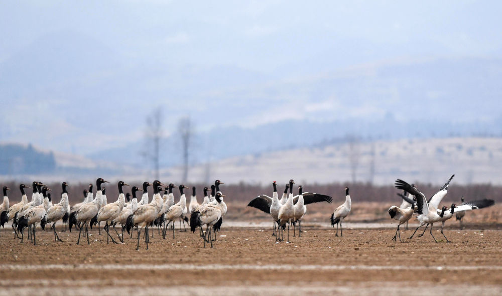 在贵州草海国家级自然保护区栖息的黑颈鹤(2023年2月9日摄)。新华社记者 杨文斌 摄