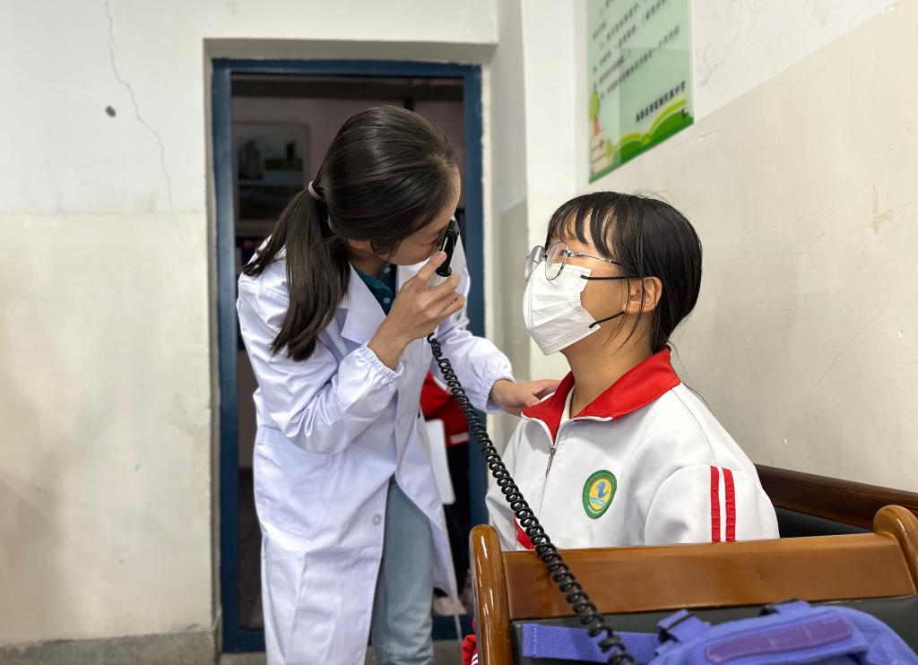 7月7日,在青海省海北藏族自治州海晏县寄宿制民族中学,北京协和医院医生在为学生做检查。新华社记者 张子琪 摄