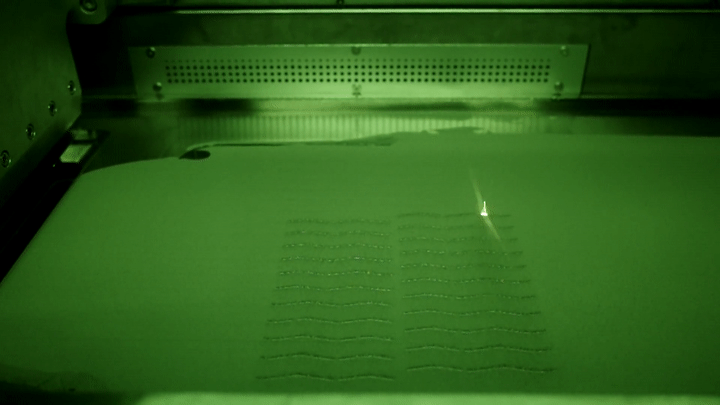 透过玻璃视窗,一道激光束跳跃着射向平铺的粉末,粉末熔融后瞬间凝固。一层完工后,刮刀重新铺粉,激光束继续击射。在完工600多层后,一批用于为轮胎加工表面花纹的金属钢片模具“出炉”了。
