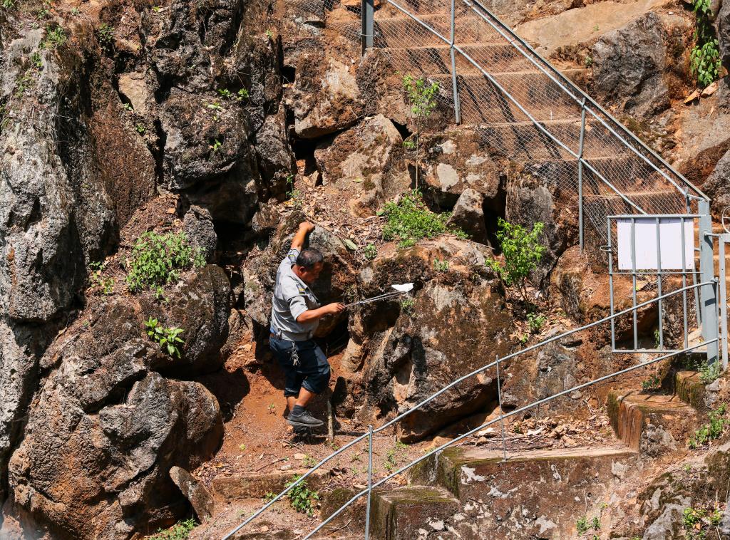 走出“人脸隧道”踏上“人字桥”,透过相机取景器,记者看到在另一端桥头的崖壁上,一个身着铁路安保制服的中年男人正在捡拾垃圾,这也是守桥人第一次进入记者的镜头。