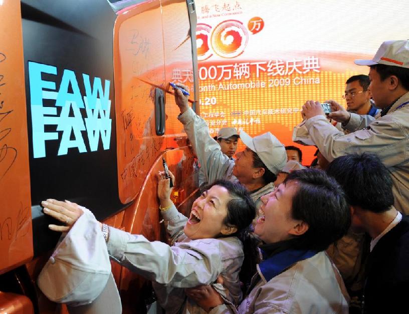 2009年10月20日,一汽解放的工人们在自己亲手生产的2009年中国第1000万辆车上签名。新华社记者 蒋林 摄